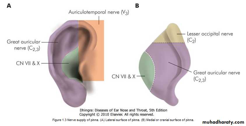 (i) Greater auricular nerve (C2,3) supplies most of the medial surface of pinna and only posterior part of the lateral surface .(ii) Lesser occipital (C2) supplies upper part of medial surface.