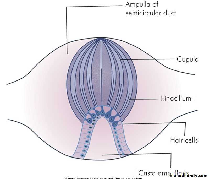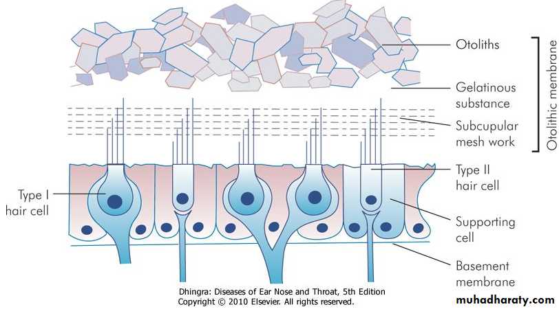 The utricle lies in the posterior part of bony vestibule. It receives the five openings of the three semicircular ducts. It is also connected to the saccule through utriculosaccular duct. The sensory epithelium of the utricle is called the macula and is concerned with linear acceleration and deceleration. The saccule also lies in the bony vestibule, anterior to the utricle and opposite the stapes footplate. Its sensory epithelium is also called the macula. Its exact function is not known. It probably also responds to linear acceleration and deceleration. In Meniere's disease, the distended saccule lies against the stapes footplate and can be surgically decompressed by perforating the footplate.3. Semicircular ducts