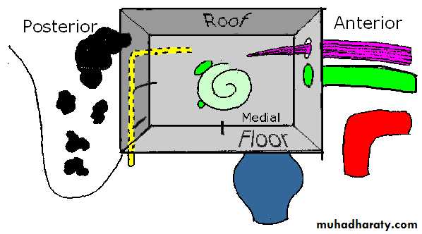 has a thin plate of bone which separates the cavity from internal carotid artery. It also has two openings; the lower one for the eustachian tube and the upper one for the canal of tensor tympani muscle.Figure 1.6 Walls of middle ear and the structures related to them.