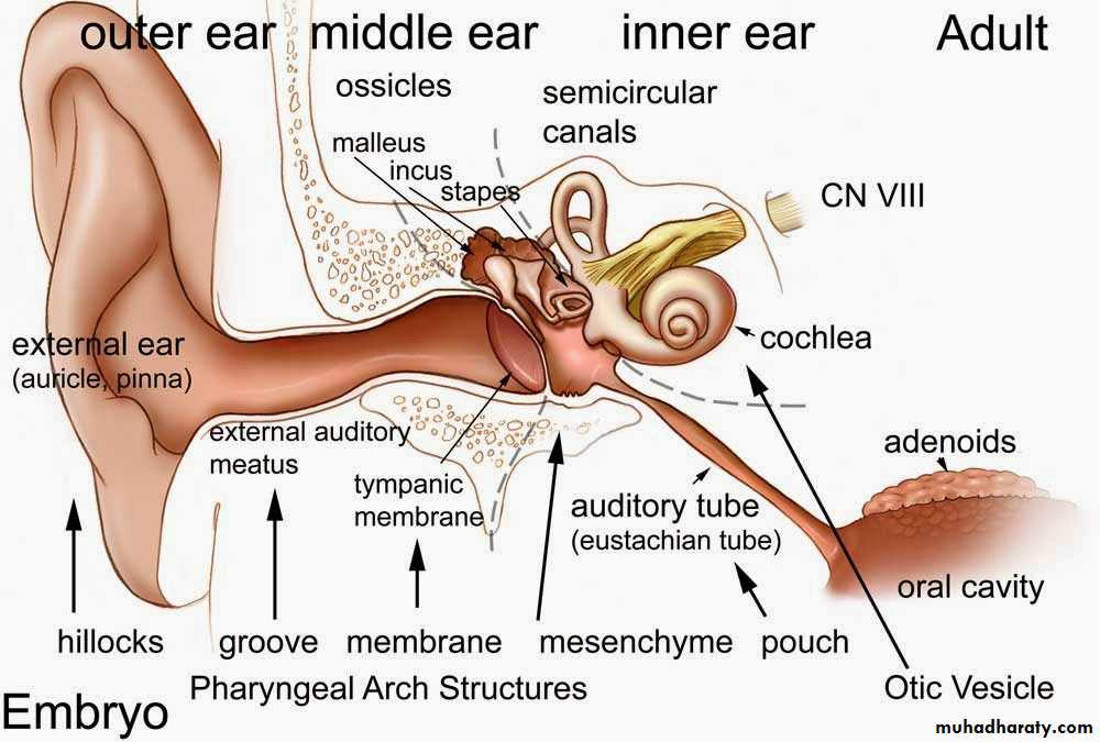 The eustachian tube, tympanic cavity, attic, antrum and mastoid air cells develop from the endoderm of tubotympanic recess which arises from the first pharyngeal pouch .Malleus and incus are derived from mesoderm of the first arch while the stapes develop from the second arch .