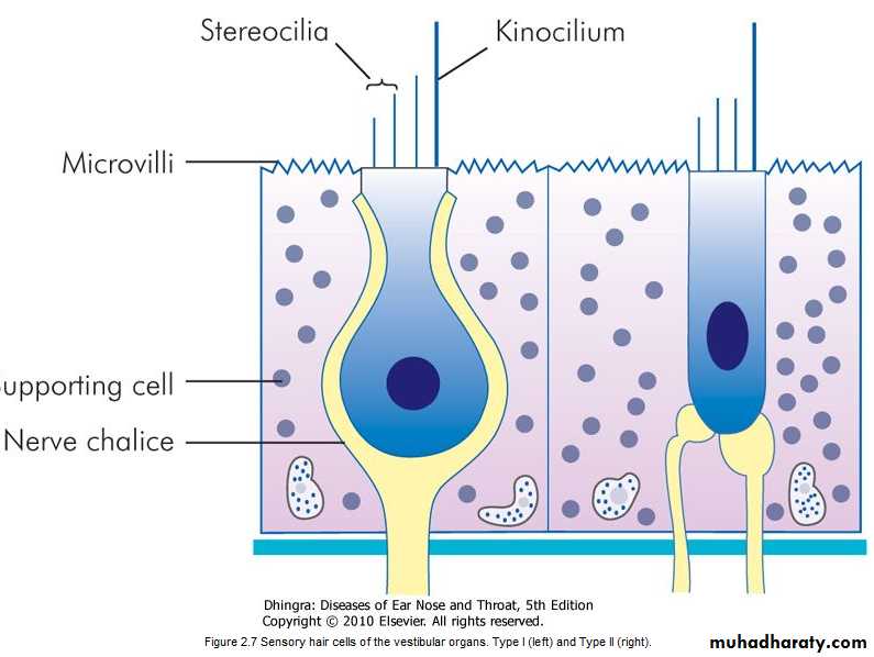 VESTIBULAR SYSTEMThe vestibular sense organ consists of the three semicircular canals, the saccule and the utricle. These are membranous tubes within the dense temporal bone, are fluid filled and have cells with cilia which bend as the fluid moves relative to them. This excites or depresses the nerve cells and alters the tonic input into the brain. The semicircular canals are at right angles to each other and detect changes in angular acceleration. The utricle and saccule have otoconia embedded in a gel overlying the cilia and are positioned to detect linear acceleration.