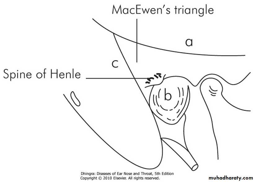 It is a large, air-containing space in the upper part of mastoid and communicates with the attic through the aditus. Its roof is formed by the tegmen antri which is a continuation of the tegmen tympani and separates it from the middle cranial fossa. The lateral wall of antrum is formed by a plate of bone which is on an average 1.5 cm thick in the adult. It is marked externally on the surface of mastoid by suprameatal (MacEwen's) triangle .Ossicles of the Middle Ear