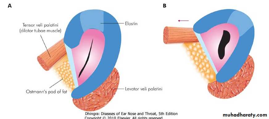 Three muscles are related to the tube: Tensor veli palatini, Levator veli palatini and the Salpingopharyngeus. The tensor veli palatine is attached to the lateral lamina of the tube, and help to open the tubal lumen. The exact role of the levator veli palatini and the Salpingopharyngeus muscles to open the tube is uncertain.Lining of the Eustachian Tube