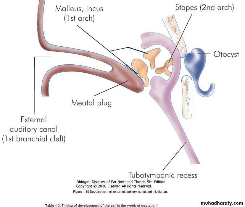develops from the first branchial cleft. By about the 16th embryonic week, ectodermal cleft forms a meatal plug. Recanalisation begins from the deeper part near the tympanic membrane and progresses outwards. External ear canal is fully formed by the 28th week of gestation.Tympanic membrane