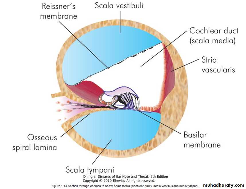 (b) the Reissner's membrane which separates it from the scala vestibuli, (c) the stria vascularis, which contains vascular epithelium and is concerned with secretion of endolymph.