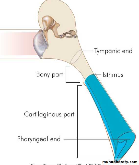 Eustachian tube, also called the auditory or the pharyngotympanic tube, connects nasopharynx with the tympanic cavity. In an adult, it is about 36 mm long and runs downwards, forwards and medially from its tympanic end, forming an angle of 45° with the horizontal. It is divided into two parts: The bony, which is posterolateral, forms one third (12 mm) of the total length and fibrocartilaginous, which is anteromedial, forms two-thirds (24 mm). The two parts meet at isthmus which is the narrowest part of the tube .The tympanic end of the tube is bony is situated in the anterior wall of middle ear, a little above the level of floor. The pharyngeal end of the tube is slit-like, vertically. The cartilage at this end raises an elevation called torus tubarius which is situated in the lateral wall of the nasopharynx, 1-1.25 cm behind the posterior end of inferior turbinate