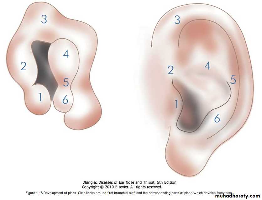 Around the sixth week of embryonic life, a series of six tubercles (hillocks of His) appear around the first branchial cleft. They progressively coalesce to form the auricle. By the 20th week, pinna achieves adult shape.External auditory meatus