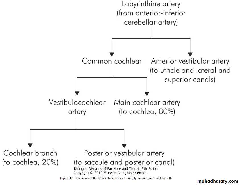 The entire labyrinth receives its arterial supply through labyrinthine artery which is a branch of anterior-inferior cerebellar artery but sometimes from the basilar.Venous drainage is through three veins, namely internal auditory vein, vein of cochlear aqueduct and vein of vestibular aqueduct which ultimately drain into inferior petrosal sinus and lateral venous sinus.