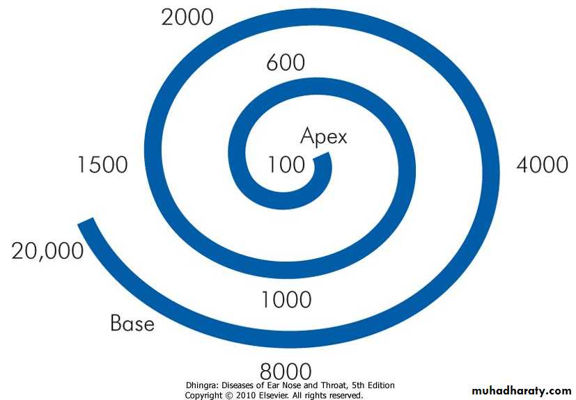 Figure 2.4 Frequency localisation in the cochlea. Higher frequencies are localised in the basal turn and then progressively decrease towards the apex.