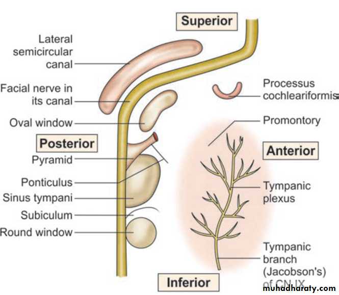 is formed by the labyrinth. It presents a bulge called promontory which is due to the basal coil of cochlea; oval window into which is fixed the footplate of stapes; round window or the fenestra cochleae which is covered by the secondary tympanic membrane. Above the oval window is the canal for facial nerve. Its bony covering may sometimes be congenitally dehiscent and the nerve may lie exposed making it very vulnerable to injuries or infection. Above the canal for facial nerve is the prominence of lateral semicircular canal. Just anterior to the oval window, the medial wall presents a hook-like projection called the processus cochleariformis. The tendon of tensor tympani takes a turn here to get attachment to the neck of malleus.The lateral wal