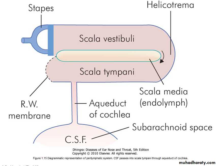The scala vestibuli and scala tympani are filled with perilymph and communicate with each other at the apex of cochlea through an opening called helicotrema. Scala vestibuli is closed by the footplate of stapes which separates it from the air-filled middle ear. The scala tympani is closed by secondary tympanic membrane; it is also connected with the subarachnoid space through the aqueduct of cochlea .