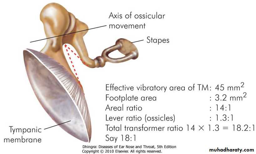 (a) Lever action of the ossicles. Handle of malleus is 1.3 times longer than long process of the incus, providing a mechanical advantage of 1.3.(b) Hydraulic action of tympanic membrane. The area of tympanic membrane is much larger than the area of stapes footplate, the average ratio between the two being 21:1. As the effective vibratory area of tympanic membrane is only two-thirds, the effective areal ratio is reduced to 14:1.