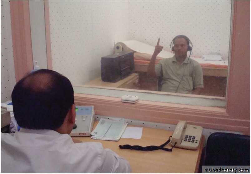 An audiometer is an electronic device which produces pure tones, the intensity of which can be increased or decreased in 5 dB steps. Usually air conduction thresholds are measured for tones of 125, 250, 500, 1000, 2000 and 4000 and 8000 Hz and bone conduction thresholds for 250, 500, 1000 and 2000 and 4000 Hz. The amount of intensity that has to be raised above the normal level is a measure of the degree of hearing impairment at that frequency. It is charted in the form of a graph called audiogram. The threshold of bone conduction is a measure of cochlear function. The difference in the thresholds of air and bone conduction (A-B gap) is a measure of the degree of conductive deafness.