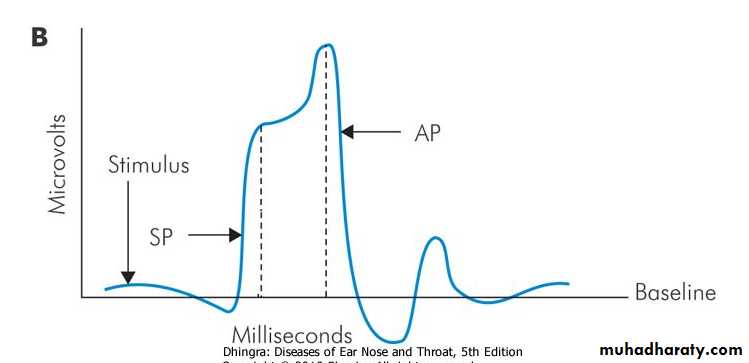 It is an objective test which measures electrical activity in the auditory pathways in response to auditory stimuli. They are: (a) Electrocochleography (EcoG) It measures electrical potentials arising in the cochlea and CN VIII in response to auditory stimuli within first 5 milliseconds. The response is in the form of three phenomena: cochlear microphonics, summating potentials and the action potential of VIIIth nerve. The recording electrode is a thin needle passed through the tympanic membrane onto the promontory. It can be done under local anaesthesia but in children or anxious persons sedation or general anaesthesia is required. Normally the ratio between the amplitude of summating potential to the action potential is less than 30%. An increase in this ratio is indicative of Mèniere's disease .Electrocochleography. (A) Normal ear. (B) Ear with Meniere's disease.
