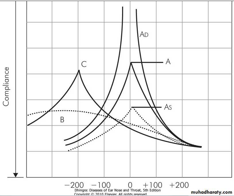 Compliance is lower at or near ambient air pressure. Seen in fixation of ossicles, e.g. otosclerosis or malleus fixation.