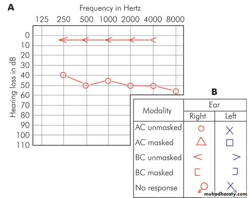 Figure 5.1 (A) Audiogram of right ear showing conductive hearing loss with A-B gap. (B) Symbols used in audiogram charting.