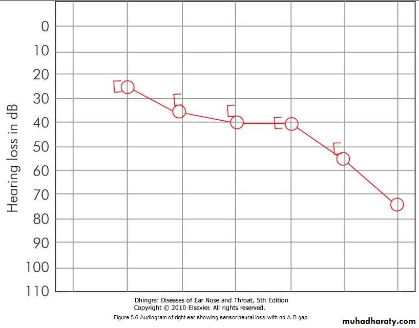 Audiogram of right ear showing sensorineural loss with no A-B gap.