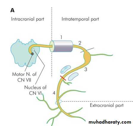 Motor fibres take origin from the nucleus of VIIth nerve, hook round the nucleus of VIth nerve and are joined by the sensory root (nerve of Wrisberg). Facial nerve leaves the brainstem , travels through posterior cranial fossa and enters the internal acoustic meatus. At the fundus of the meatus (lateral most part of meatus), the nerve enters the bony facial canal, traverses the temporal bone and comes out of the stylomastoid foramen. The course of the nerve can thus be divided into: