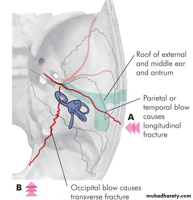 1. Fractures of Temporal BoneFractures of temporal bone may be longitudinal, transverse or mixed . Facial palsy is seen more often in transverse fractures (50%). Paralysis is due to intraneural haematoma, compression by a bony spicule or transection of nerve. In these cases, it is important to know whether paralysis was of immediate or delayed onset. Delayed onset paralysis is treated conservatively like Bell's palsy while immediate onset paralysis may require surgery in the form of decompression, re-anastomosis of cut ends or cable nerve graft.
