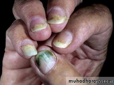 Repeated exposure to soap and water causes maceration of the hyponychium and softening of the nail plate. Separation of the nail plate (onycholysis) exposes a damp, macerated space between the nail plate and the nail bed, which is a fertile site for the growth of Pseudomonas.The nail plate assumes a green-black color. There is little discomfort or inflammation.