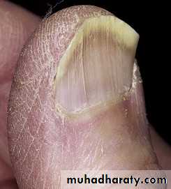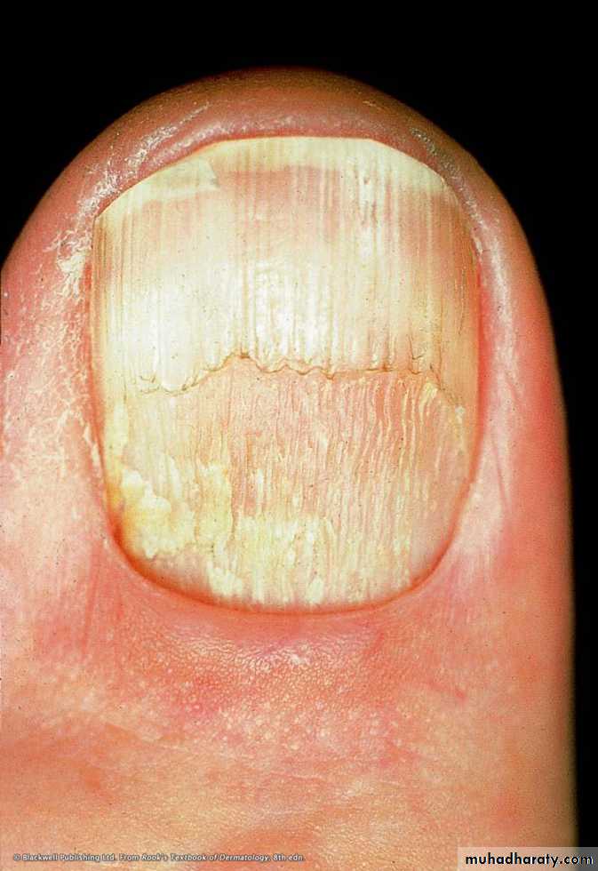 Begins at the distal groove and progresses irregularly and proximally, causing part or most of the plate to become separated.The nonadherent portion of the nail is opaque with a white, yellow or green tinge.