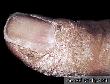 Rx: Separated skin should be cut before extension occurs. Constant lubrication of the fingertips with skin creams and avoidance of repeated hand immersion in water are beneficial.