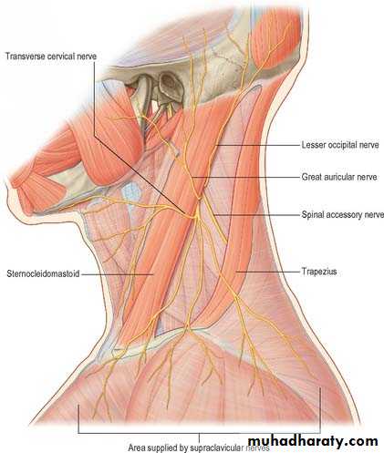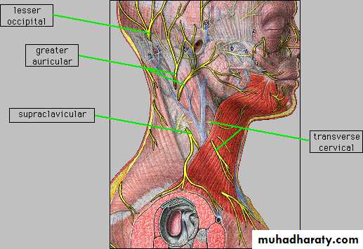 The supraclavicular nerves (C3 and 4): The medial ,and intermediate, and lateral branches supply the skin over the shoulder region.