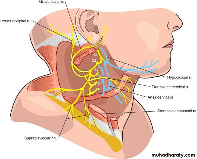 The transverse cervical nerve (C2 and 3): which supplies the skin over the front of the neck