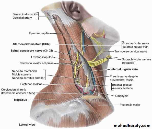 Laterally: Related to the emerging branches of the cervical plexus, the roots of the brachial plexus, and the third part of the subclavian artery .