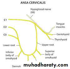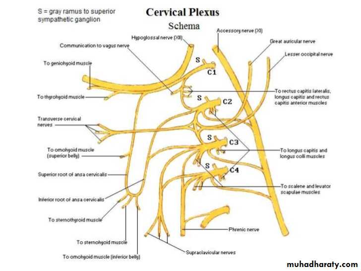 Prevertebral muscles, sternocleidomastoid (proprioceptive, C2 and 3), levator scapulae (C3 and 4), and trapezius (proprioceptive, C3 and 4). A branch from C1 joins the hypoglossal nerve. Some of these Cl fibers later leave the hypoglossal as the descending branch, which unites with the descending cervical nerve (C2 and 3), to form the ansa cervicalis. The first, second, and third cervical nerve fibers within the ansa cervicalis supply the omohyoid, stemohyoid, and stemothyroid muscles. Other Cl fibers within the hypoglossal nerve leave it as the nerve to the thyrohyoid and geniohyoid .Muscular branch to the diaphragm. Phrenic nerve