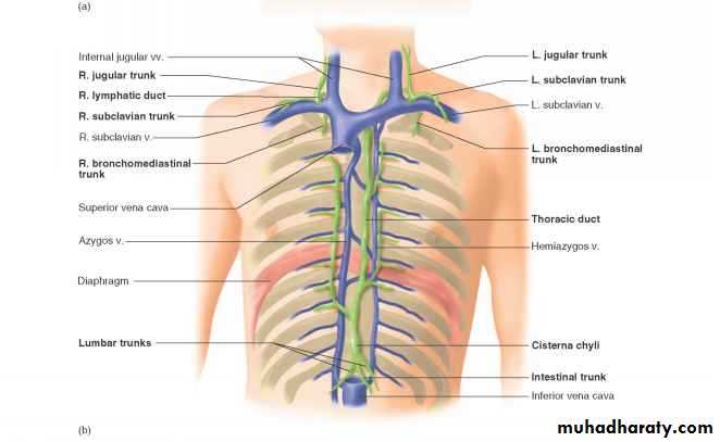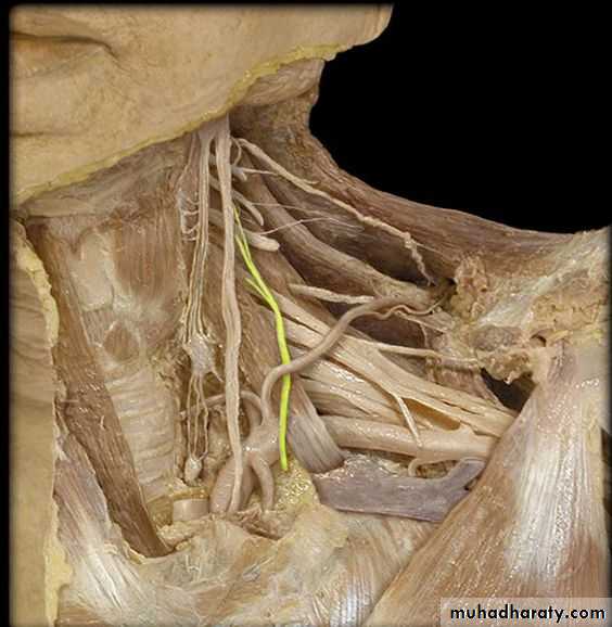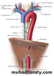 The thoracic duct begins in the abdomen at the upper end of the cisterna chyli. It enters the thorax through the aortic opening in the diaphragm and ascends through the posterior mediastinum, inclining gradually to the left. On reaching the superior mediastinum, it is found passing upward along the left margin of the esophagus. At the root of the neck, it continues to ascend along the left margin of the esophagus until it reaches the level of the transverse process of the seventh cervical vertebra. Here, it bends laterally behind the carotid sheath. On reaching the medial border of the scalenus anterior, it turns downward and drains into the beginning of the left brachiocephalic vein. It may, however, end in the terminal part of the subclavian or internal jugular veins.Main Nerves of the Neck