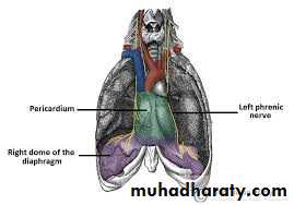 Phrenic NerveThe phrenic nerve arises in the neck from the 3rd, 4th, and 5th cervical nerves of the cervical plexus. It runs vertically downward across the front of the scalenus anterior muscle and enters the thorax by passing in front of the subclavian artery .The phrenic nerve is the only motor nerve supply to the diaphragm. It also sends sensory branches to the pericardium, the mediastinal parietal pleura, and the pleura and peritoneum covering the upper and lower surfaces of the central part of the diaphragm.