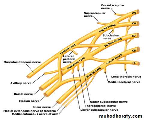 The brachial plexus is formed in the posterior triangle of the neck by the union of the anterior rami of the 5th, 6th, 7th, and 8th cervical and the first thoracic spinal nerves. This plexus is divided into roots, trunks, divisions, and cords. The roots of C5 and 6 unite to form the upper trunk, the root of C7 continues as the middle trunk, and the roots ofC8 and T1 unite to form the lower trunk.Each trunk then divides into anterior and posterior divisions. The anterior divisions of the upper and middle trunks unite to form the lateral cord, the anterior division of the lower trunk continues as the medial cord, and the posterior divisions of all three trunks join to form the posterior cord.