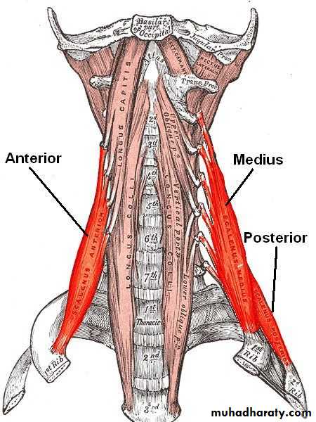 The scalenus medius lies behind the scalenus anterior and extends from the transverse process of the atlas and the transverse processes of the next five cervical vertebrae downward and laterally to be inserted into the upper surface of the 1st rib behind the groove for the subclavian artery. The muscle lies behind the roots of the brachial plexus and the subclavian artery.