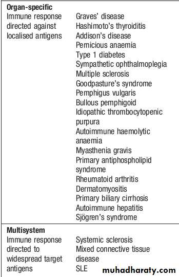 The spectrum of autoimmune diseases is broad. They can be classified by organ involvement or by the predominant mechanism responsible for tissue damage.The Gell and Coombs classification of hypersensitivity is the most widely used, and distinguishes four types of immune response which result in bystander tissue damage.