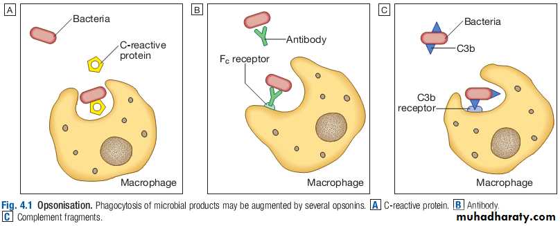 While phagocytes can recognise microorganisms through pattern recognition receptors alone, engulfment of microorganisms is greatly enhanced by opsonisation.Opsonins include acute phase proteins such as Creactive protein (CRP), antibodies and complement.