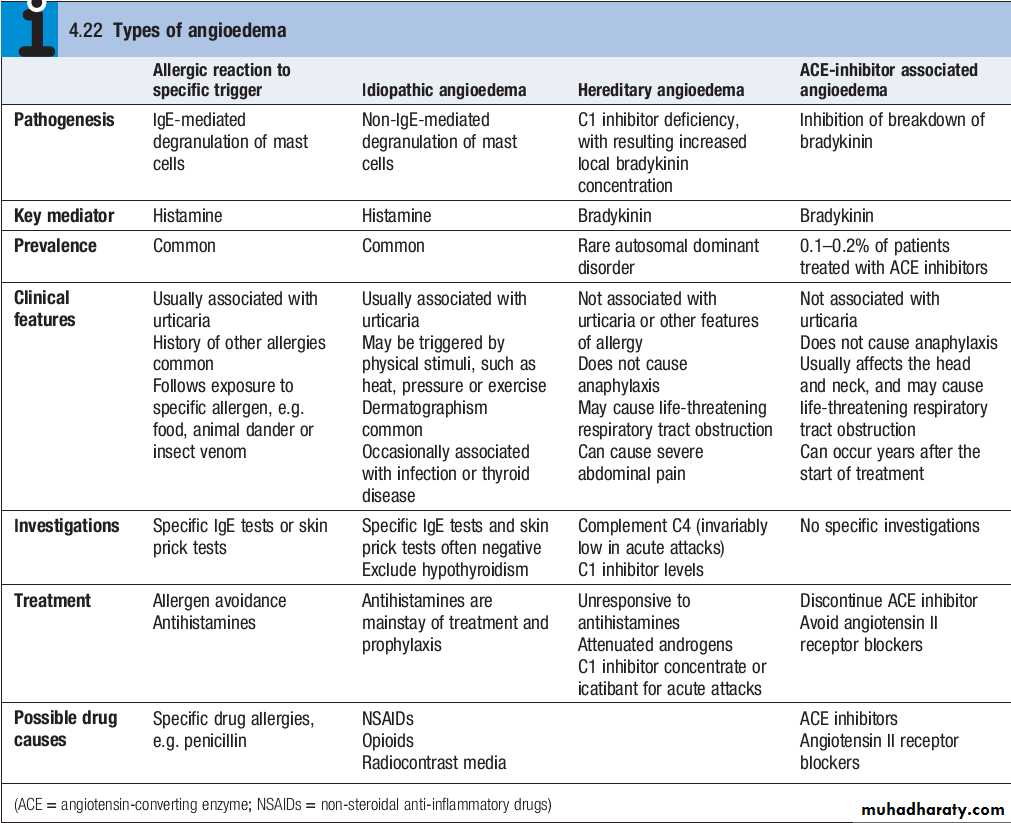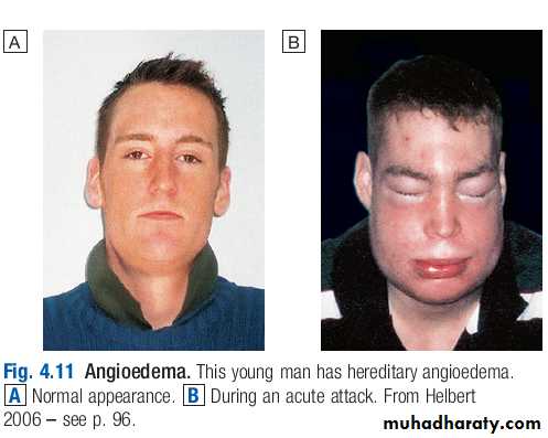 Angioedema is the episodic, localised, nonpitting swelling of submucous or subcutaneous tissues.This most frequently affects the face,extremities and genitalia. Involvement of the larynx or tongue may cause lifethreatening respiratory tract obstruction, and oedema of the intestinal mucosa may cause abdominal pain and distension.