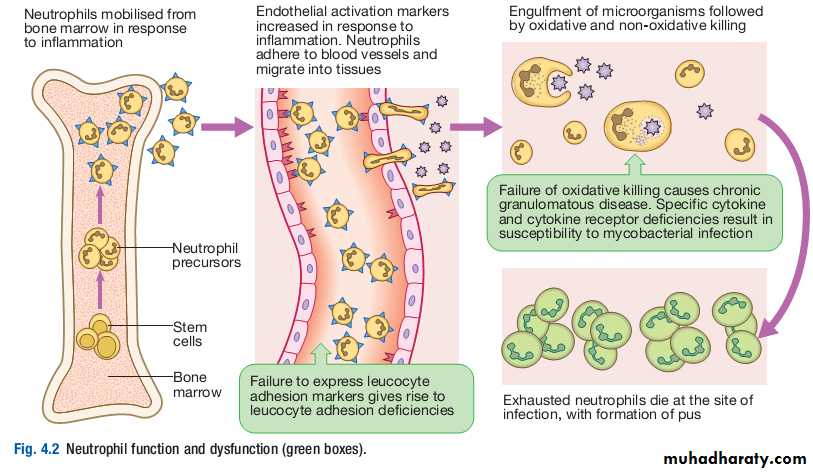 Neutrophils, also known as polymorphonuclear leucocytes, are derived from the bone marrow. They are shortlived cells with a halflife of 6 hours in the blood stream.