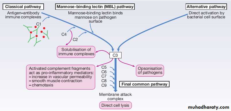 Activation of complement by any of these pathways results in activation of C3. This, in turn, activates the final common pathway, in which the complement proteins C5–C9 assemble to form the membrane attack complex. This can puncture target cell walls, leading to osmotic cell lysis.This step is particularly important in the defence against encapsulated bacteria, such as Neisseriaspp. and Haemophilus influenzae.