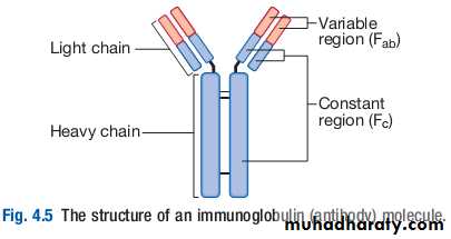The antigen is recognised by the antigenbinding regions (Fab) of both heavy and light chains, while the consequences of antibodybinding are determined by the constant region of the heavy chain (Fc).