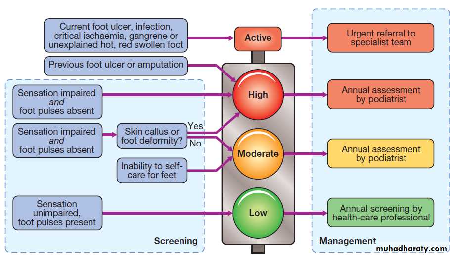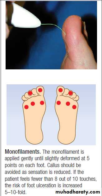 are required to grade a patient’s risk: a 10 g monofilament should be used to assess sensation at five points on each foot, and foot pulses should be palpated (dorsalis pedis and/or posterior tibial). Combined with the