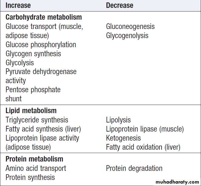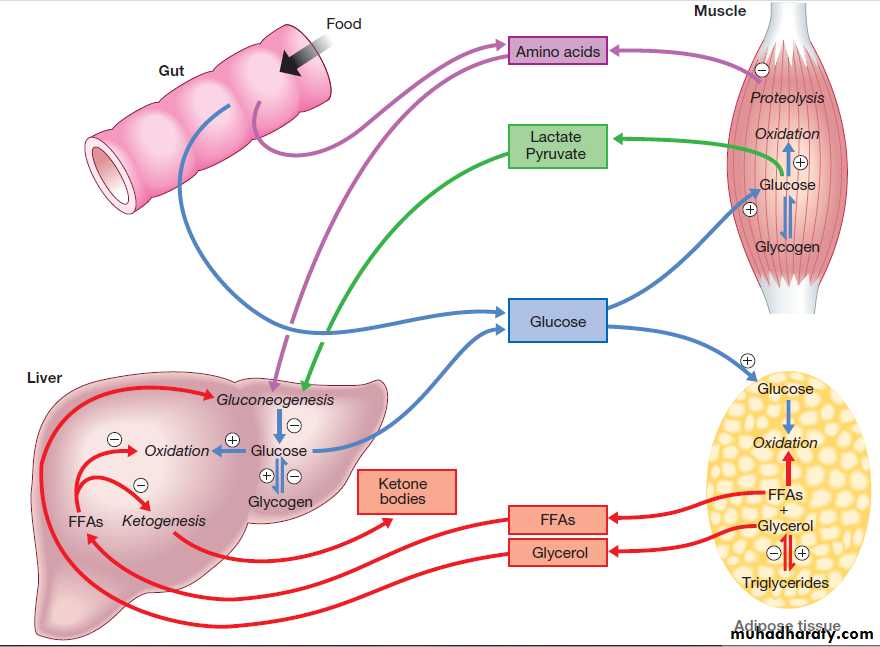 Fig. Major metabolic pathways of fuel metabolism and the actions of insulin. ⊕ indicates stimulation and ⊖ indicates suppression by insulin. In response to a rise in blood glucose, e.g. after a meal, insulin is released, suppressing gluconeogenesis and promoting glycogen synthesis and storage. Insulin promotes the peripheral uptake of glucose, particularly in skeletal muscle, and encourages storage (as muscle glycogen). It also promotes protein synthesis and lipogenesis, and suppresses lipolysis. The release of intermediate metabolites, including amino acids (glutamine, alanine), 3-carbon intermediates in oxidation (lactate, pyruvate) and free fatty acids (FFAs), is controlled by insulin. In the absence of insulin, e.g. during fasting, these processes are reversed and favour gluconeogenesis in liver from glycogen, glycerol, amino acids and other 3-carbon precursors.