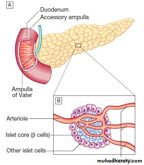 Fig. Pancreatic structure and endocrine function. A The normal adult pancreas contains about 1 million islets, which are scattered throughout the exocrine parenchyma. B The core of each islet consists of β cells that produce insulin, and is surrounded by a cortex of endocrine cells that produce other hormones, including glucagon (α cells), somatostatin (δ cells) and pancreatic polypeptide (PP cells).