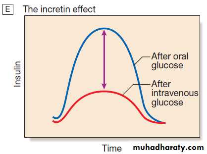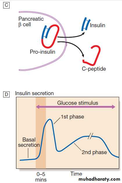 C Pro-insulin in the pancreatic β cell is cleaved to release insulin and equimolar amounts of inert C-peptide (connecting peptide). Measurement of C-peptide can be used to assess endogenous insulin secretory capacity. D An acute first phase of insulin secretion occurs in response to an elevated blood glucose, followed by a sustained second phase. E The incretin effect describes the observation that insulin secretion is greater when glucose is given by mouth than when glucose is administered intravenously to achieve the same rise in blood glucose concentrations. The additional stimulus to insulin secretion is mediated by release of peptides from the gut and these actions are exploited in incretin-based therapies