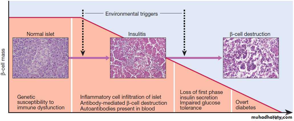 involving destruction of the insulin-secreting β cells in the pancreatic islets. Progressive loss of β cell function takes place over a prolonged period (months to years), classical symptoms s, occurs only when 80–90% of the functional capacity of β cells has been lost. The pathology in the pre-diabetic pancreas is characterised by ‘insulitis’ with infiltration of the islets by mononuclear cells containing activated macrophages, helper cytotoxic and suppressor T lymphocytes, natural killer cells and B lymphocytes. The destructive process is β cell specific, the glucagon and other hormone-secreting cells in the islet remaining intact.