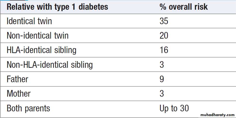 The HLA haplotypes DR3 and/or DR4 are associated with increased susceptibility to type 1 diabetes in Caucasians and are in ‘linkage disequilibrium’, i.e. they tend to be transmitted together, with the neighbouring alleles of the HLA-DQA1 and DQB1 genes. The genes associated with type 1 diabetes overlap with those for other autoimmune disorders, such as coeliac and thyroid disease, consistent with clustering of these conditions in individuals or families. Environmental predisposition