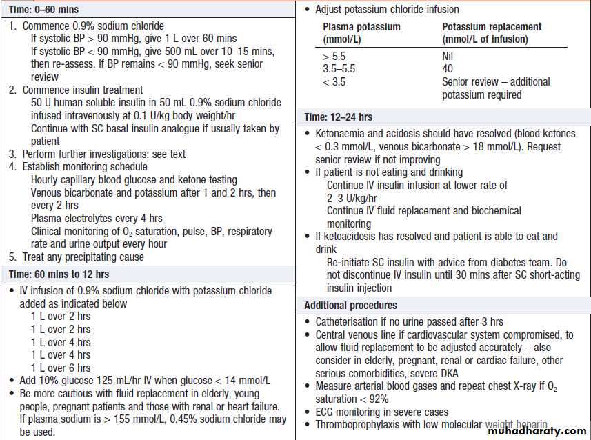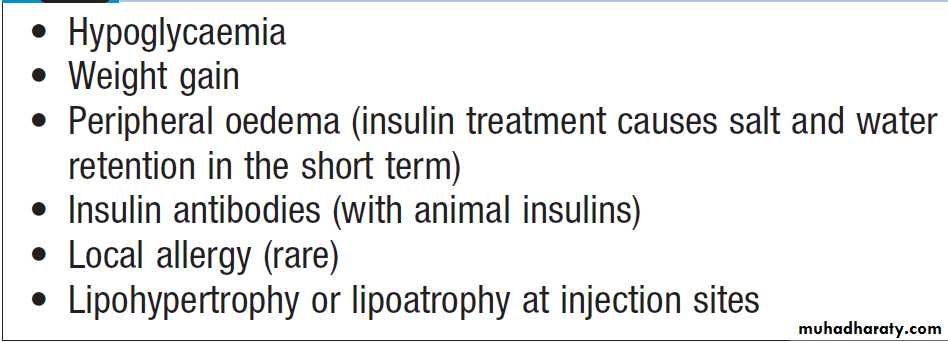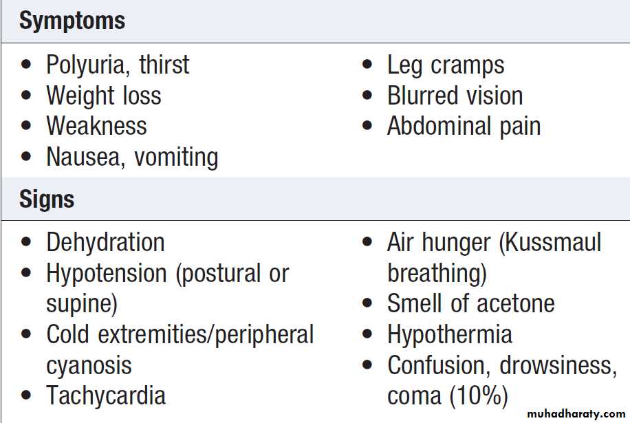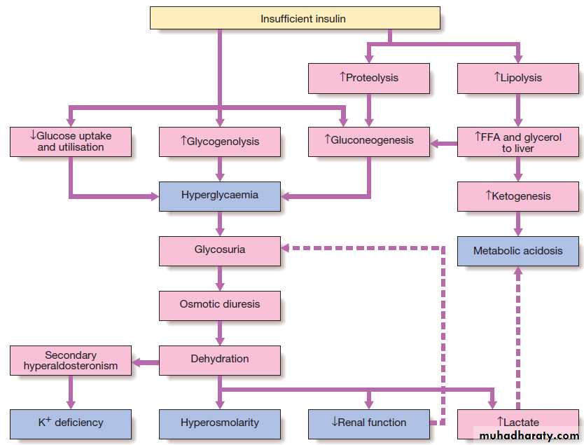 Type 1 diabetes present when progressive β-cell destruction has crossed a threshold. Above a certain level, high glucose levels may be toxic to the remaining β cells, so that profound insulin deficiency rapidly ensues, causingthe metabolic sequelae shown in Figure . Unrestrained lipolysis and proteolysis result in weight loss. Ketoacidosis occurs when generation of ketone bodies exceeds the capacity for their metabolism. Elevated H+ ions drive K+ out of the intracellular compartment, while secondary hyperaldosteronism encourages urinary loss of K+. Thus patients usually present with a short history