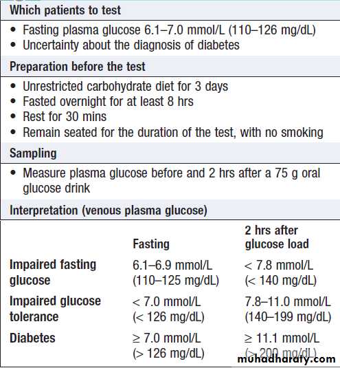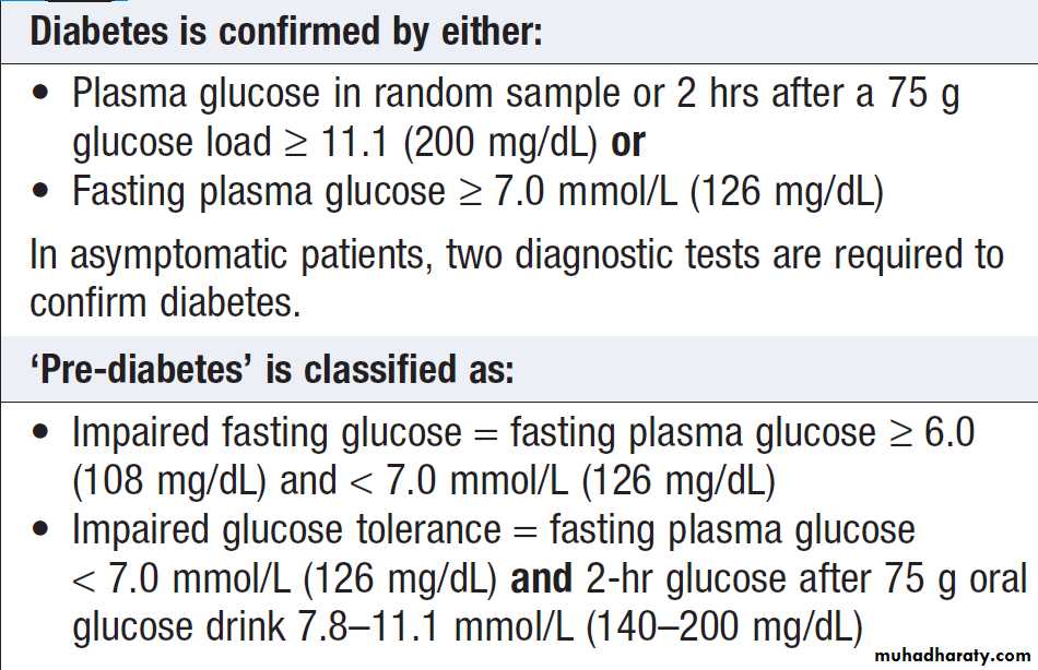 The diagnostic criteria for diabetes (a fasting plasma glucose ≥ 7.0 mmol/L (126 mg/ dL) or glucose 2 hours after an oral glucose challenge ≥ 11.1 mmol/L (200 mg/ dL) have been selected to identify those who have a degree of hyperglycaemia which, if untreated, carries a significant risk of microvascular disease, and in particular diabetic retinopathy.