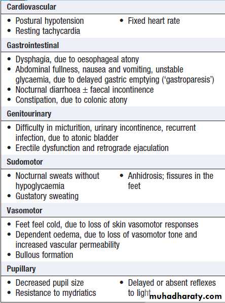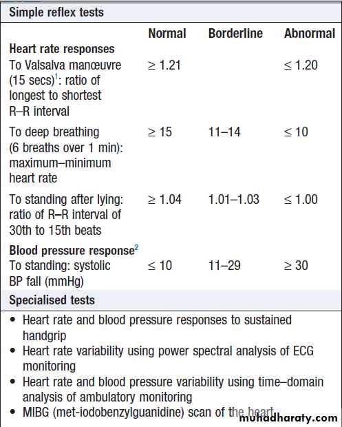 Box and tests of autonomic function in Box. The development of autonomic neuropathy is less clearly related to poor metabolic control than somatic neuropathy, and improved control rarely results in improved symptoms. Within 10 years of developing overt symptoms of autonomic neuropathy, 30–50% of patients are dead, many from sudden cardiorespiratory arrest. Patients with postural hypotension (a drop in systolic pressure of 30 mmHg or more on standing from the supine position) have the highest subsequent mortality.