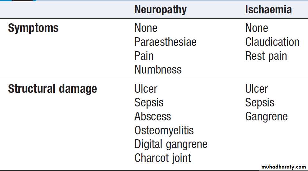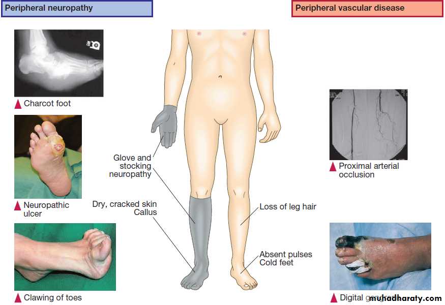 Fig. Diabetic foot disease. Patients with diabetes can have neuropathy, peripheral vascular disease or both. Clawing of the toes is thought to be caused by intrinsic muscle atrophy and subsequent imbalance of muscle function, and causes increased pressure on the metatarsal heads and pressure on flexed toes, leading to increased callus and risk of ulceration. A Charcot foot occurs only in the presence of neuropathy, and results in bony destruction and ultimately deformity (this X-ray shows a resulting ‘rocker bottom foot’). The angiogram shows disease of the superficial femoral arteries (occlusion of